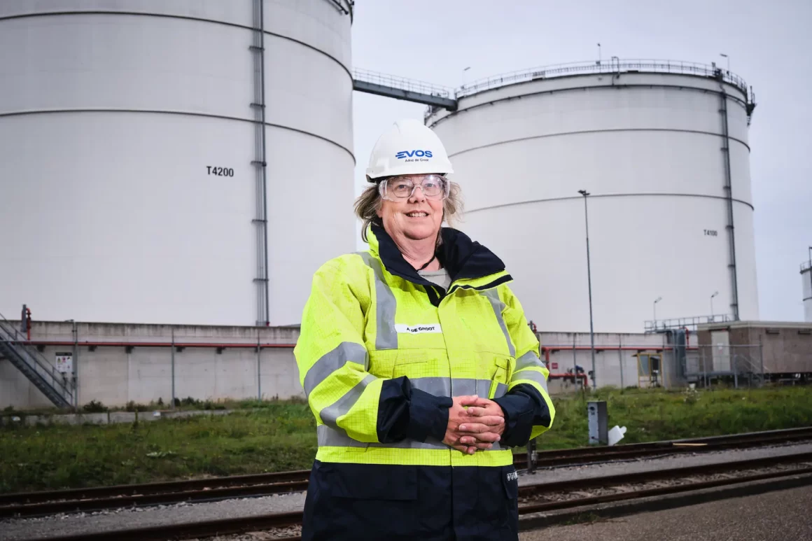 Ik werk hier sinds december ’24, maar het voelt al heel vertrouwd. Sinds 2016 vervul ik vergelijkbare rollen, onder meer bij Cabot en Kemira, met een kort uitstapje naar 020 (KLM). Evos trok me door de groeifase, de nieuwe projecten en de stevige milieuambities waar ik de komende jaren graag praktisch aan bijdraag. Mijn basis is HTS Chemische Techno- logie. Werken als vrouw in een mannenwereld is voor mij niet nieuw, het is nooit anders geweest. Op de terminal bij Evos is er een goede balans man-vrouw: ook mijn HSSEQ-manager Monique Verhage is vrouw en er zijn meer vrouwelijke colle- ga’s. Geen dag is hetzelfde, precies wat ik zoek. We starten met het ochtendoverleg met bijzondere werkzaamheden.
